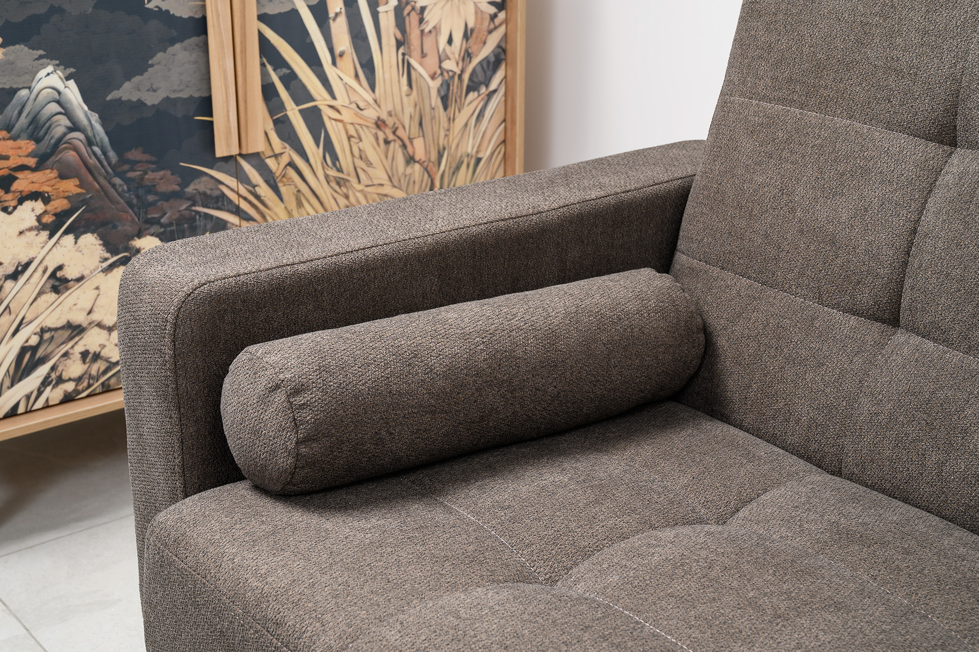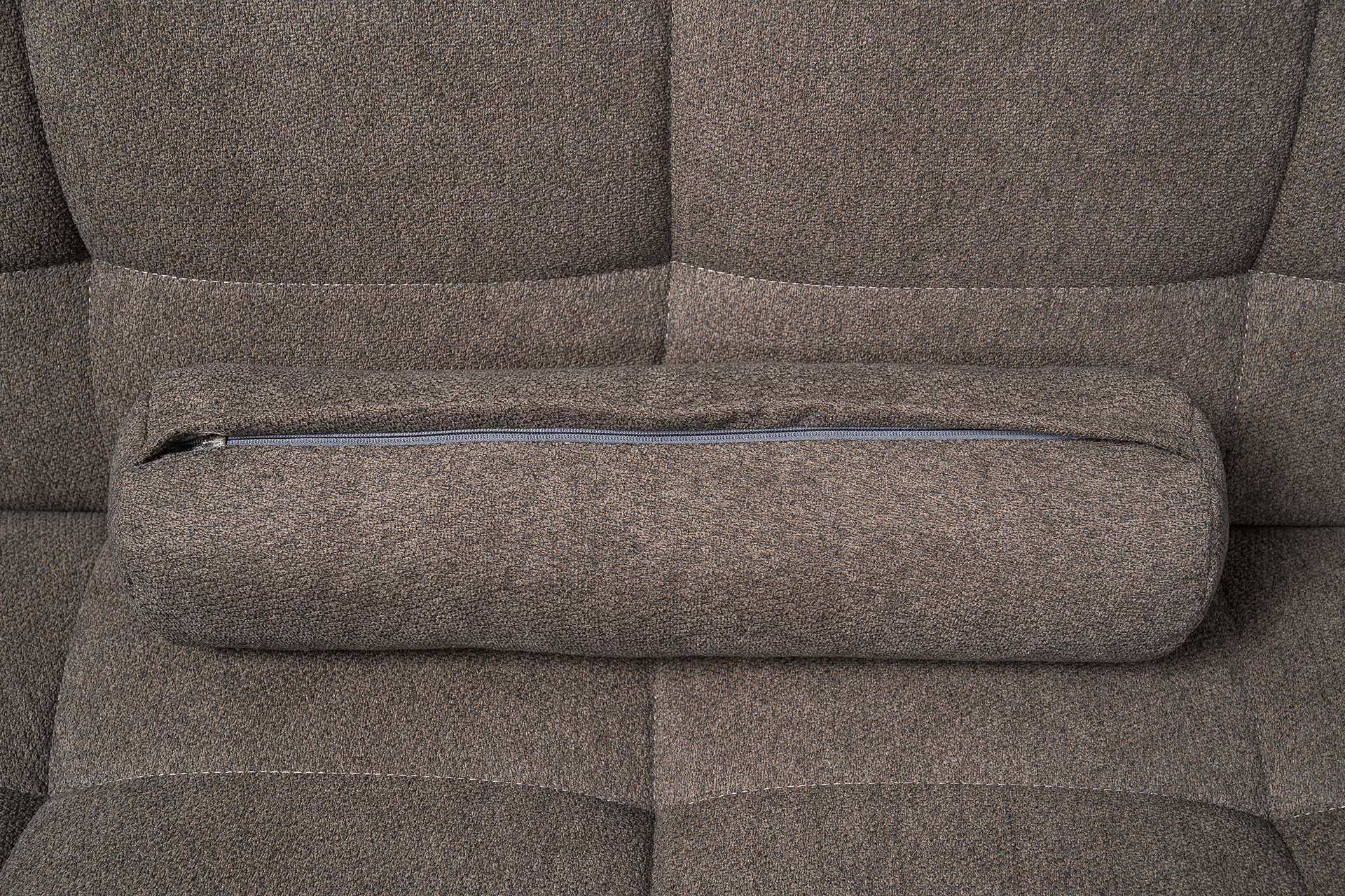 Прямоугольная стежка по спинке, посадочному месту и подлокотниках, круглые подушки-валики