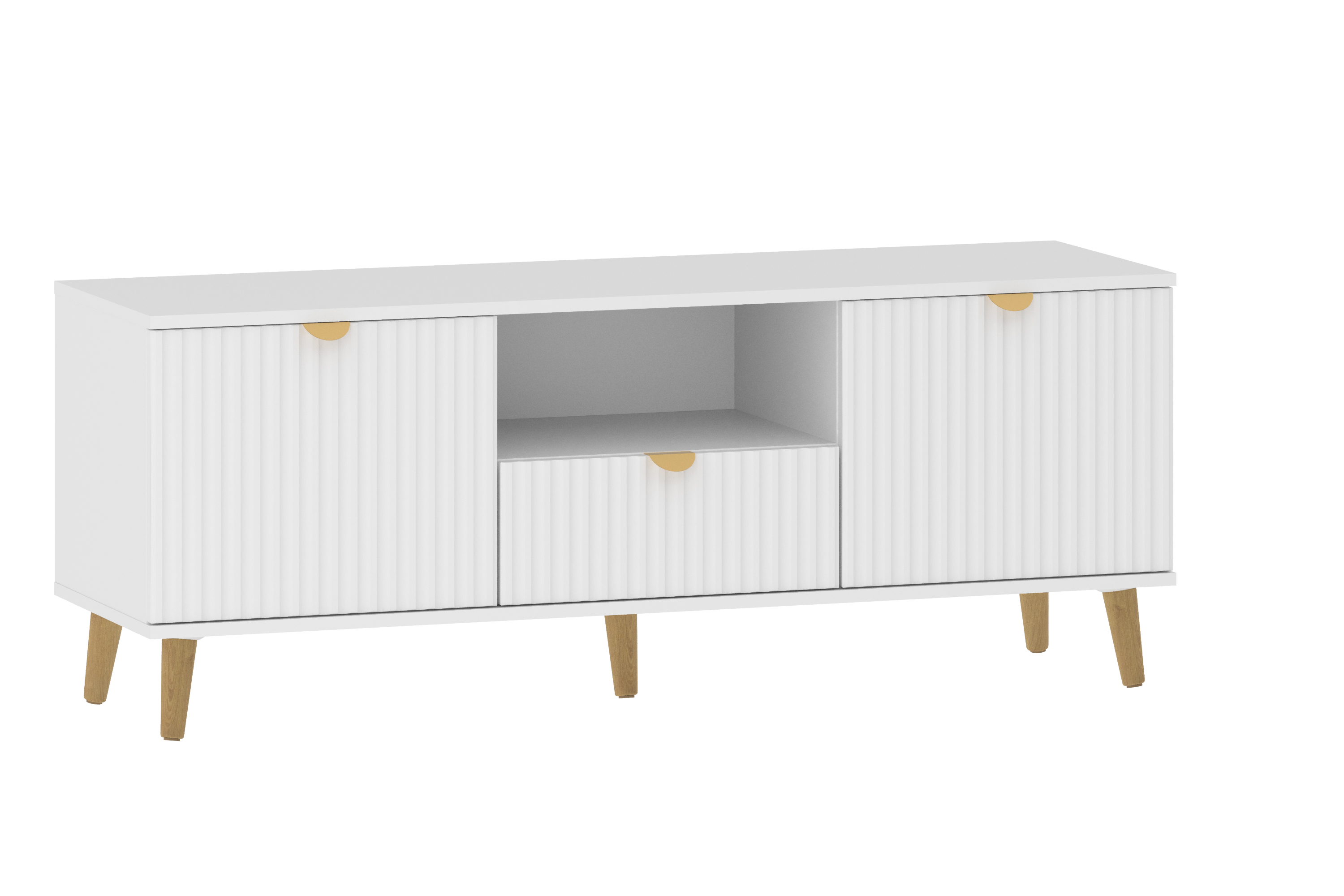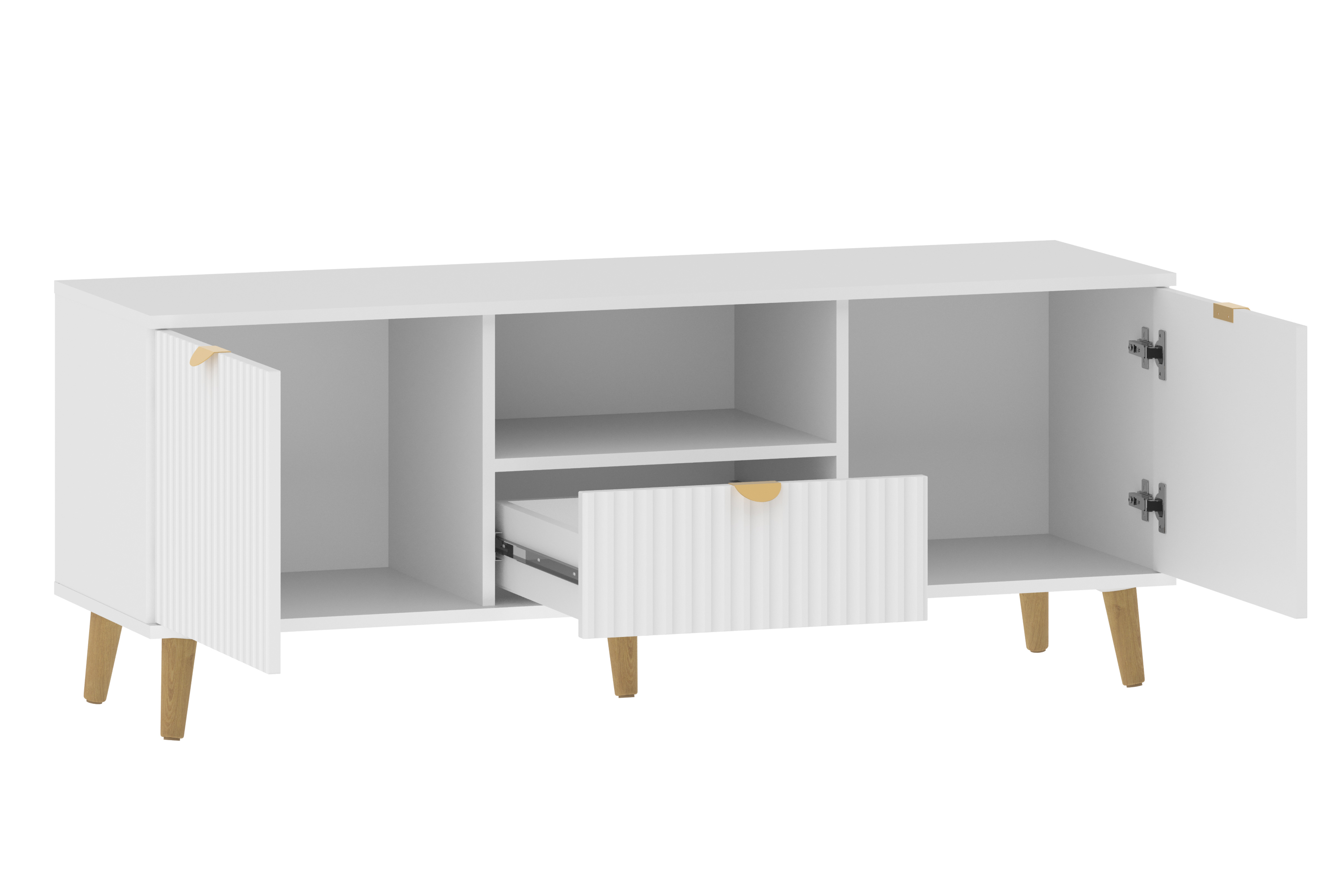 Модульная композиция включает комод и тумбу ТВА, оснащенные выдвижными ящиками, которые открываются плавно и бесшумно благодаря шариковым направляющим, а в шкафу удобно организовать книги, предметы декора или посуду, при этом высокие опоры облегчают процесс уборки.