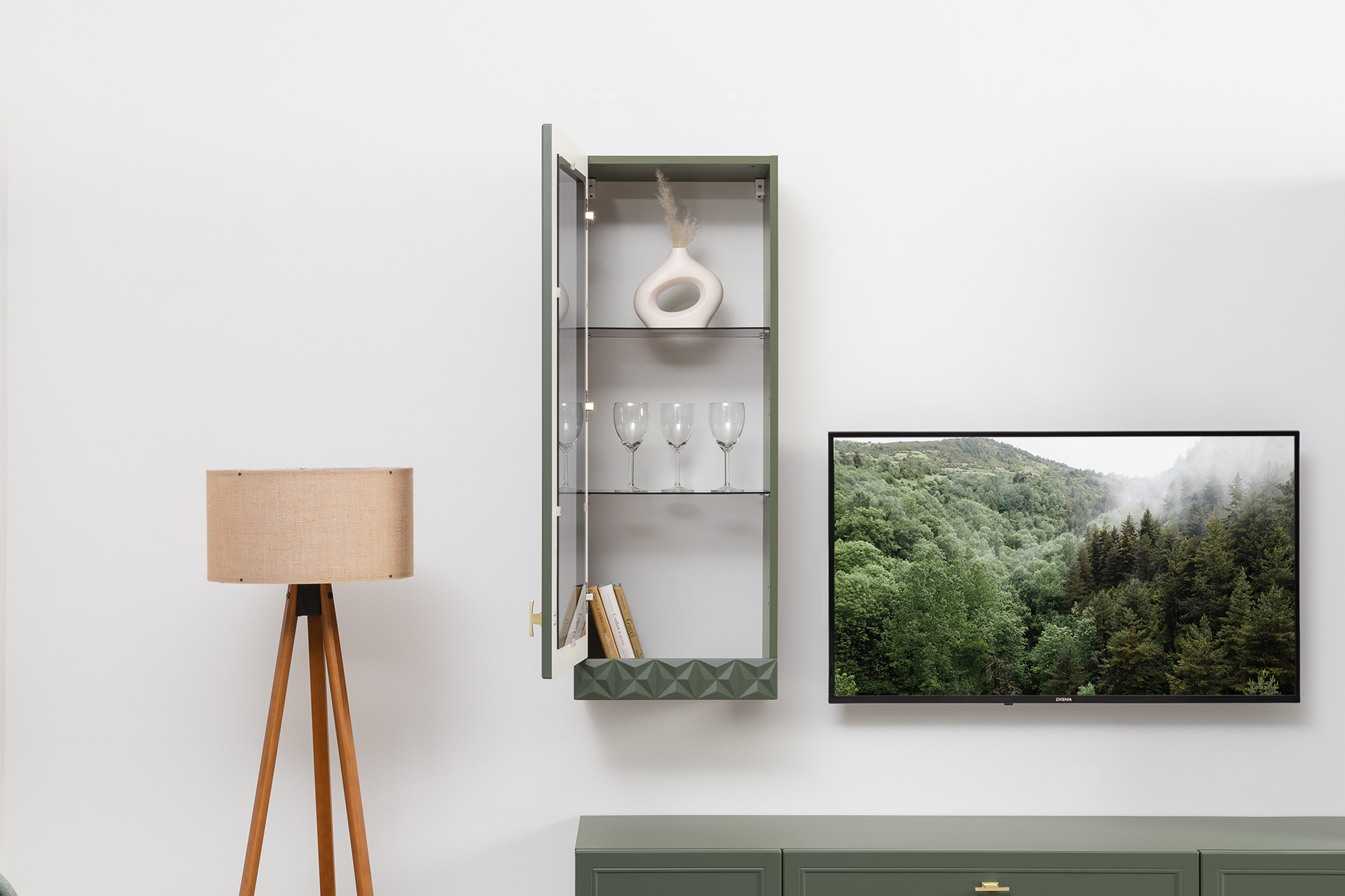 Изящные линии, глубокая фрезеровка фасадов из МДФ и благородные оттенки. Утончённая «Слоновая кость» и изысканная «Олива Шагрень» с глубоким зелёным тоном — создают атмосферу уюта, тепла и благородства. Металлические ручки и опоры золотого цвета придают мебели утончённый блеск, а петли и направляющие с доводчиками обеспечивают плавное и бесшумное закрытие фасадов.