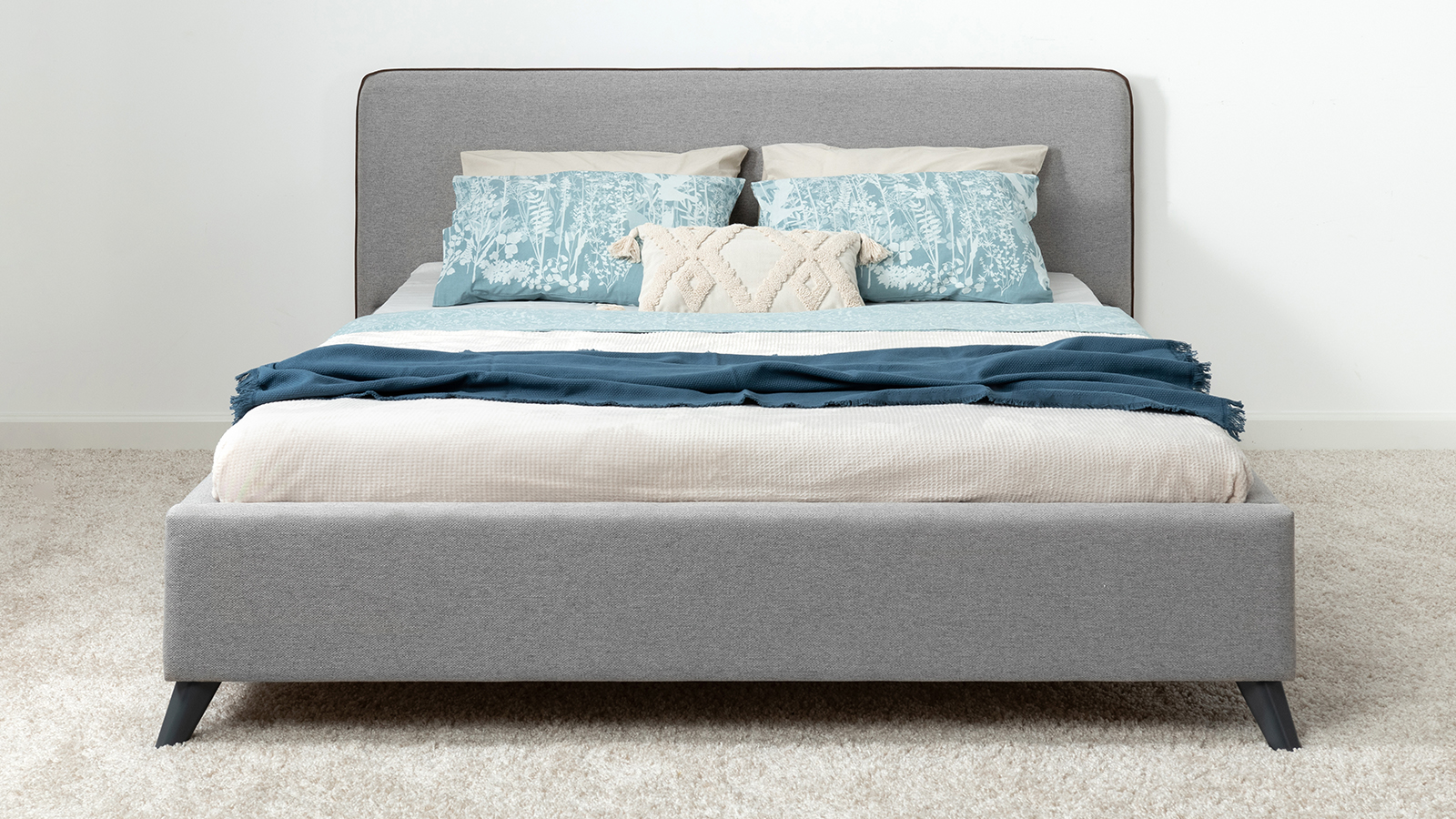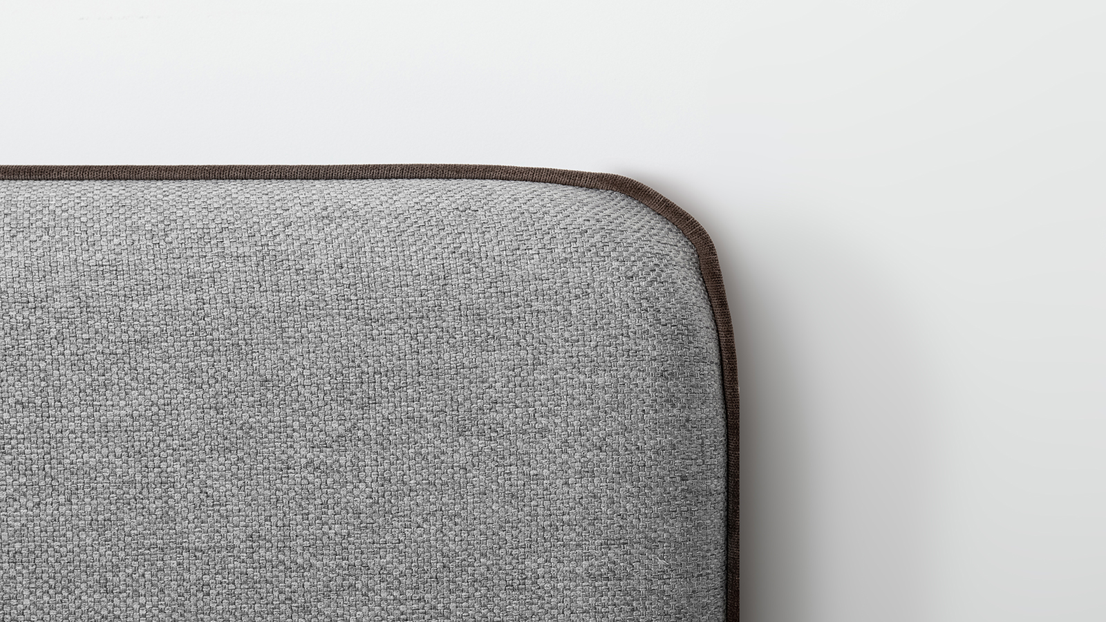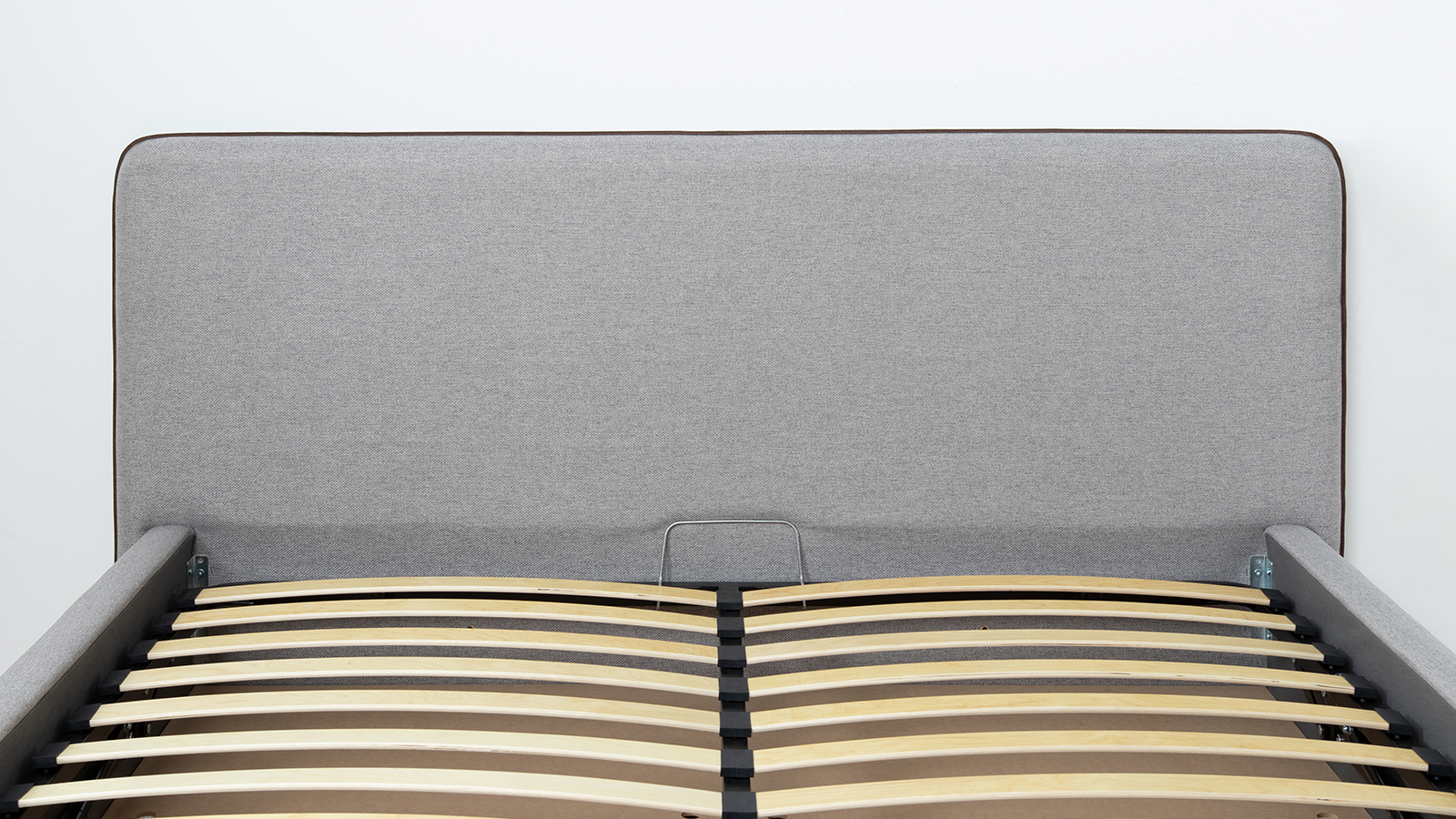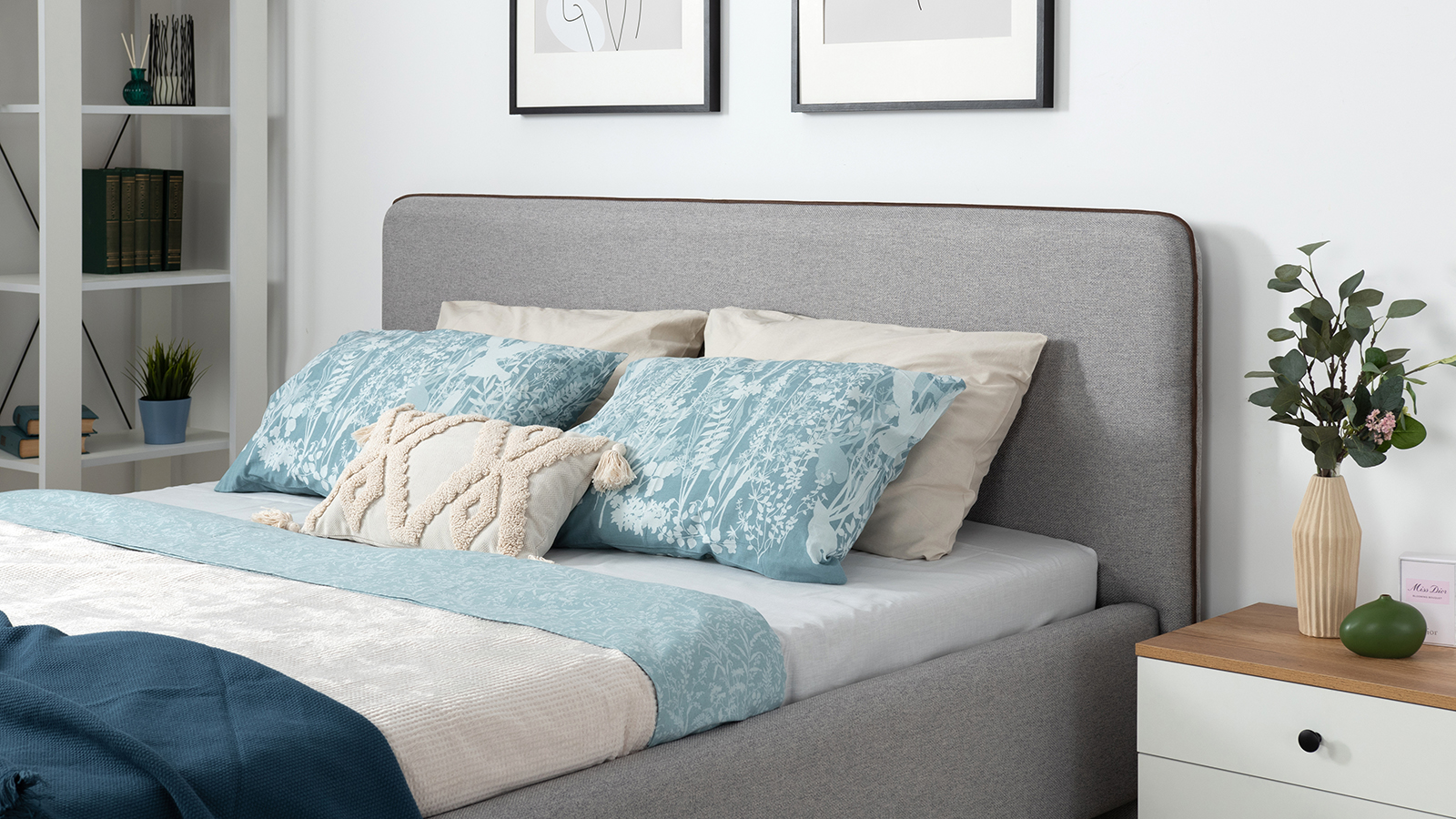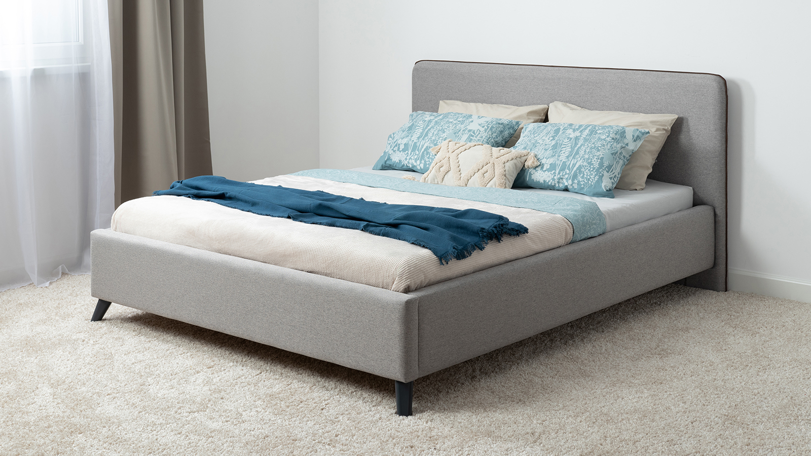 Кровать Миа 160 рогожка серый, кант желтовато-коричневый с ортопедическим основанием и подъемным механизмом