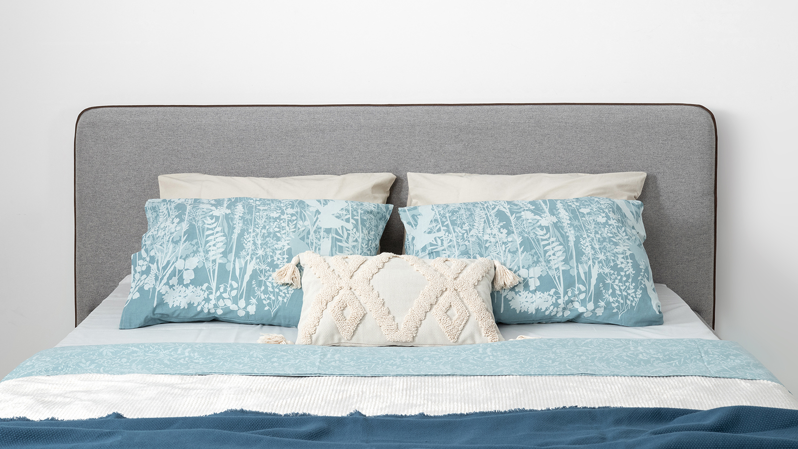 Кровать Миа 140 рогожка светло-синий, кант желтовато-коричневый с ортопедическим основанием и подъемным механизмом