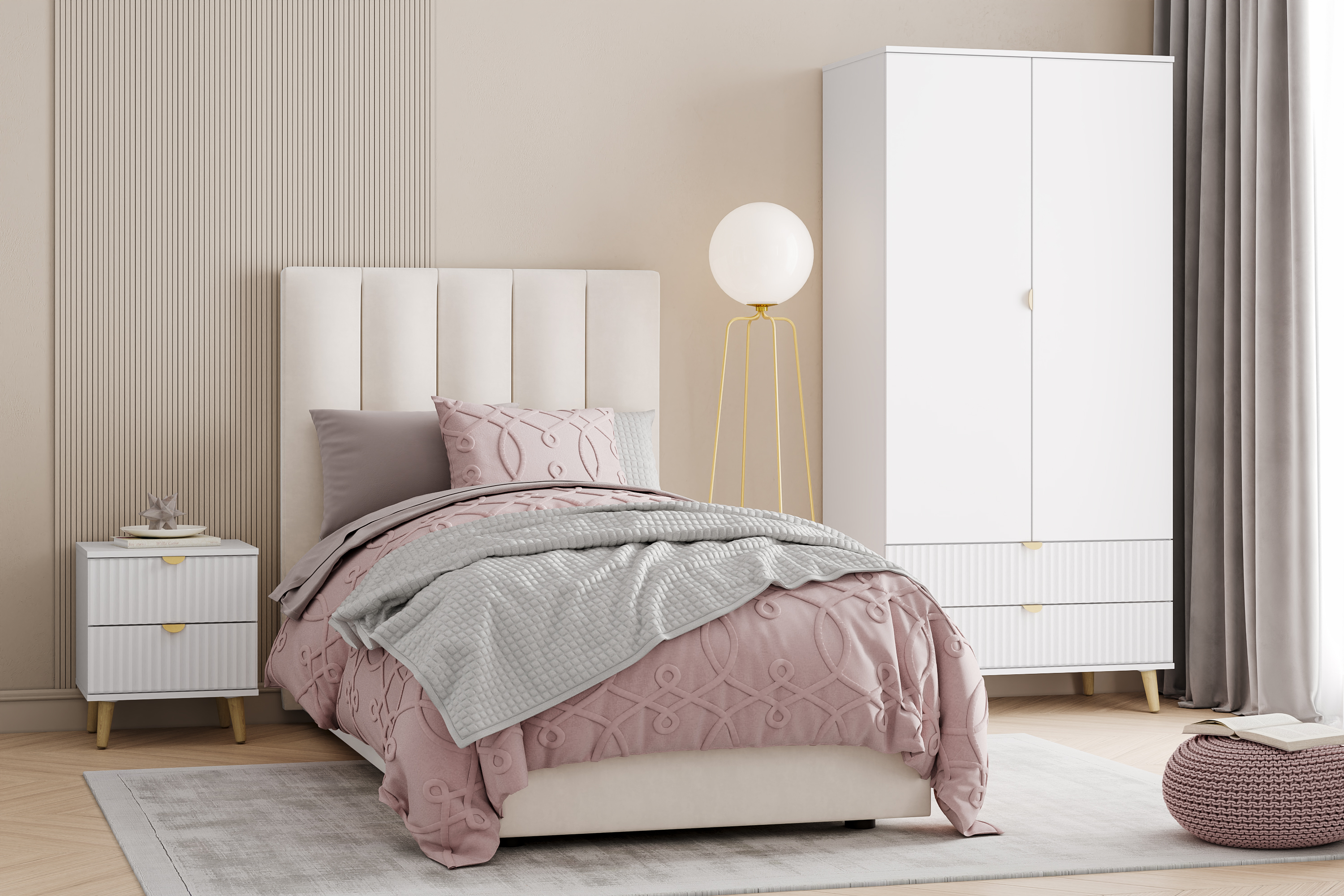 Шкаф оснащен двумя выдвижными ящиками, которые открываются плавно и бесшумно благодаря шариковым направляющим, полками, а также овальной штангой для организации предметов гардероба, а высокие опоры облегчают процесс уборки.