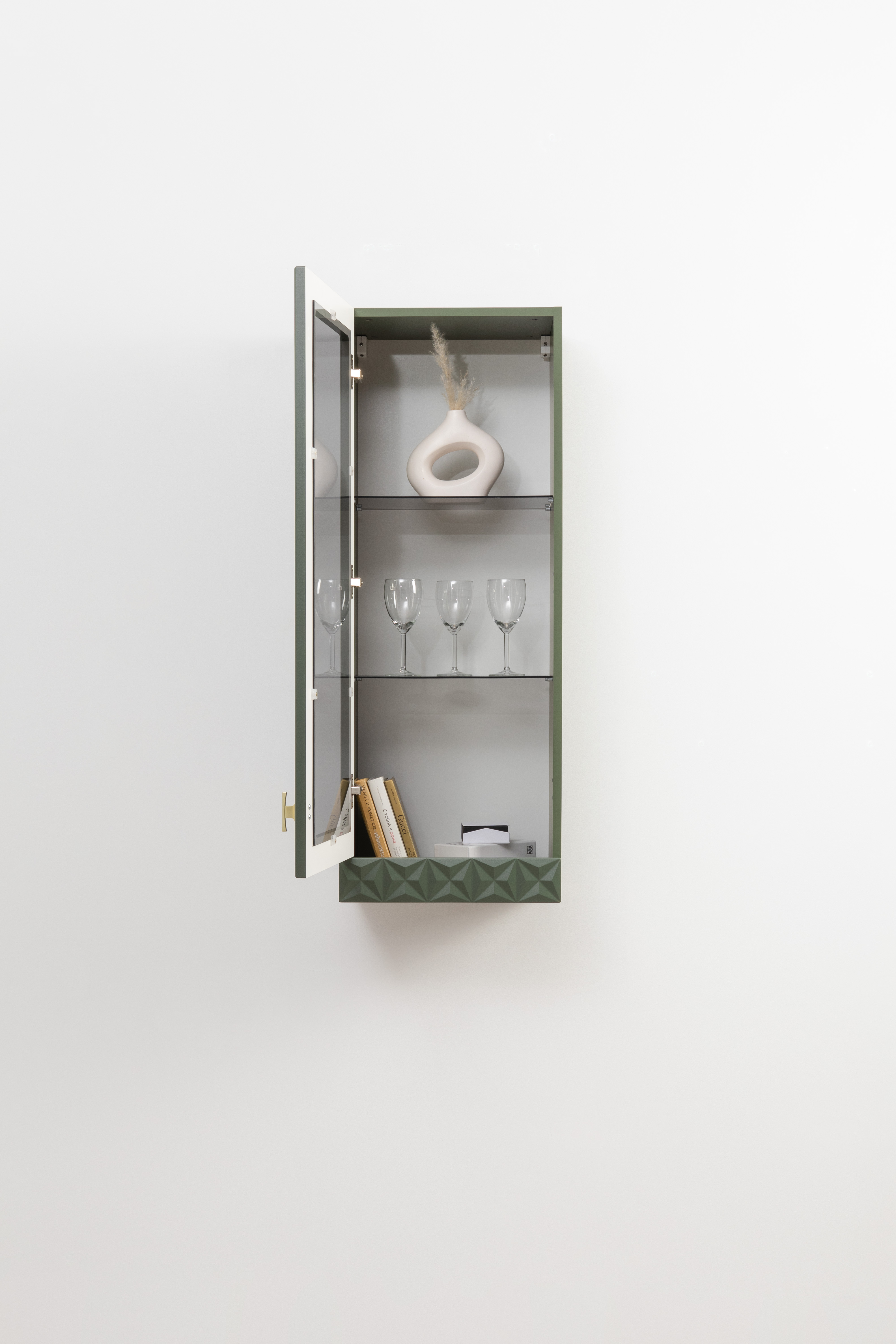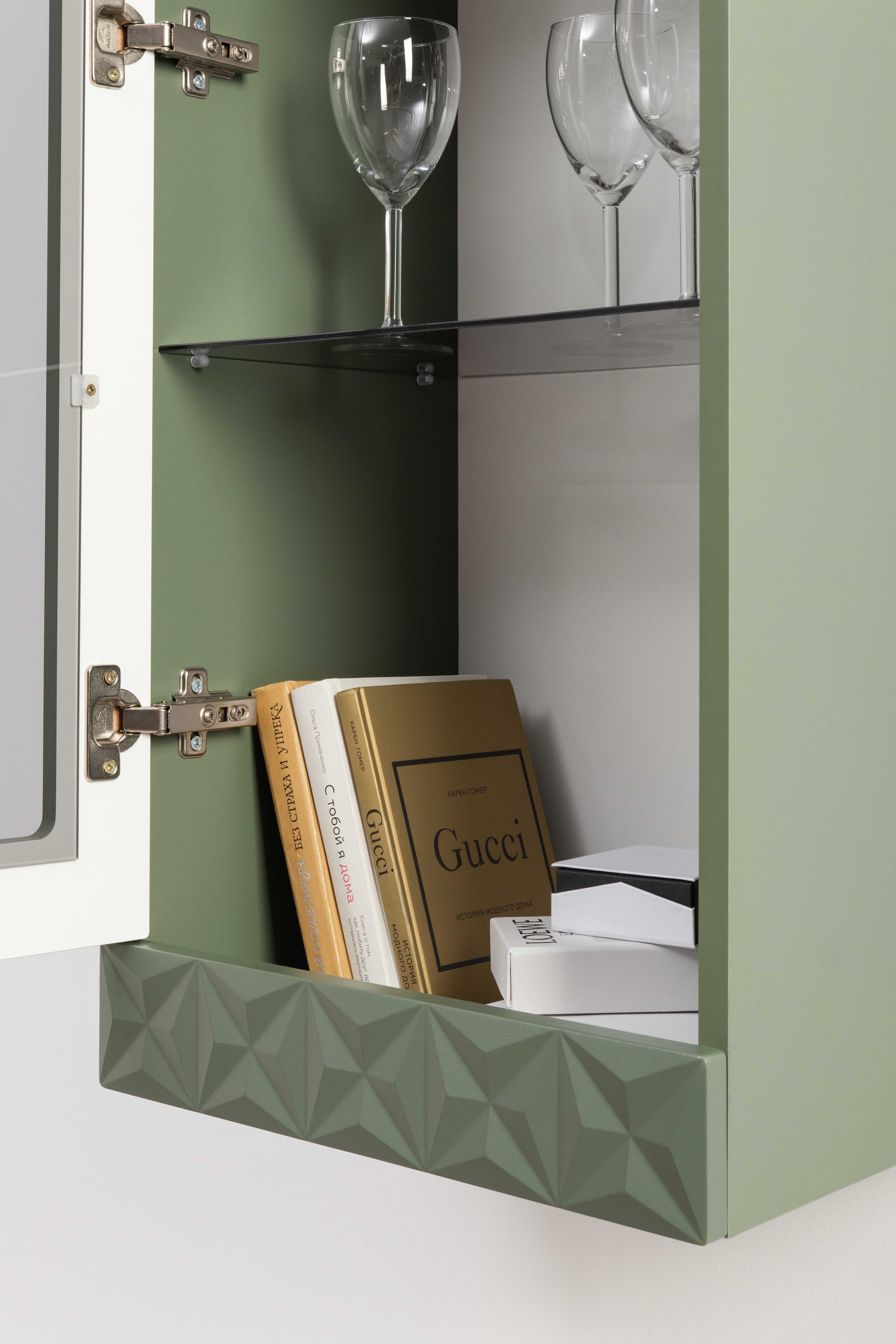 Шкаф навесной Марион 16.334 дымчатый зеленый K521, олива шагрень AG 1050 ПВХ (собирается на любую сторону)