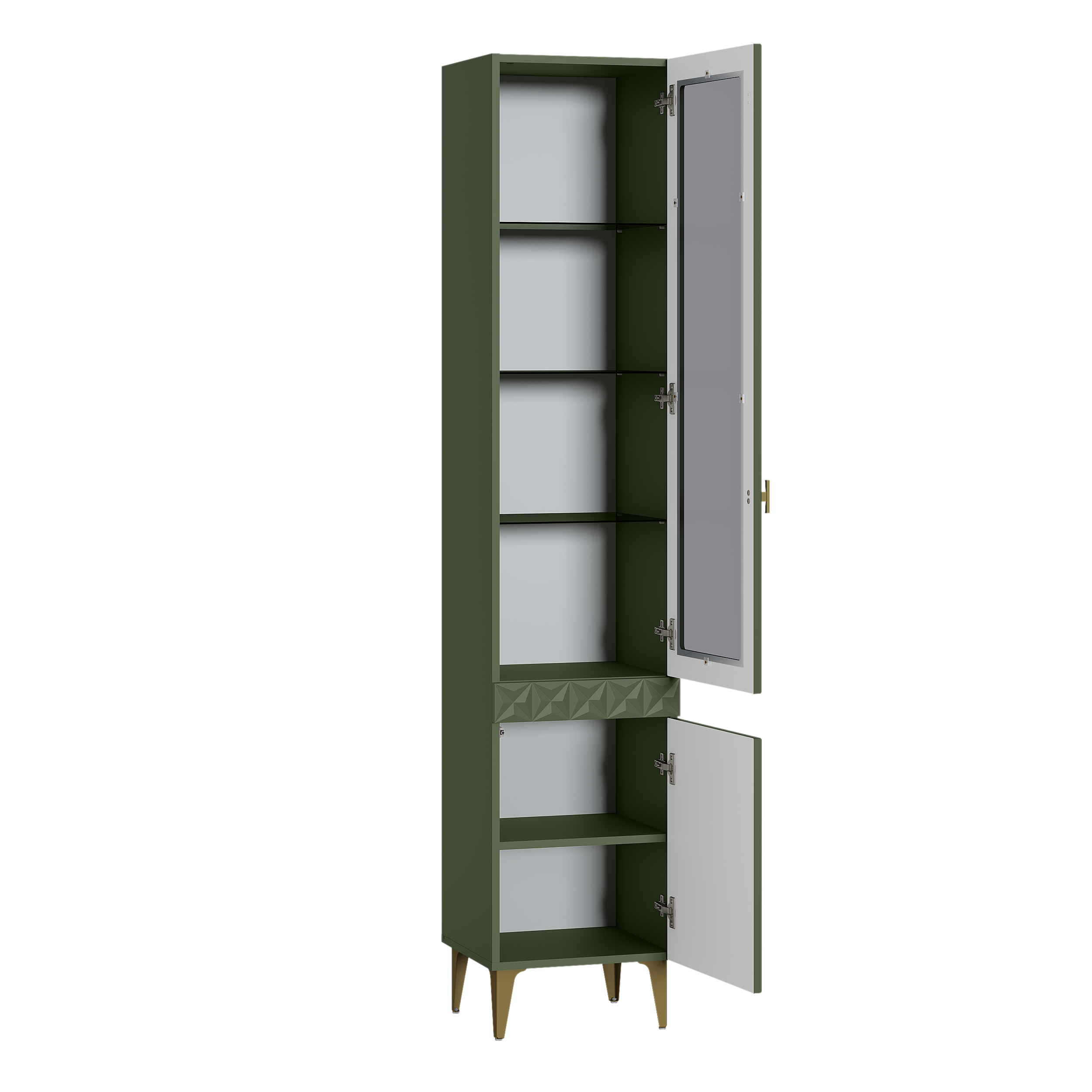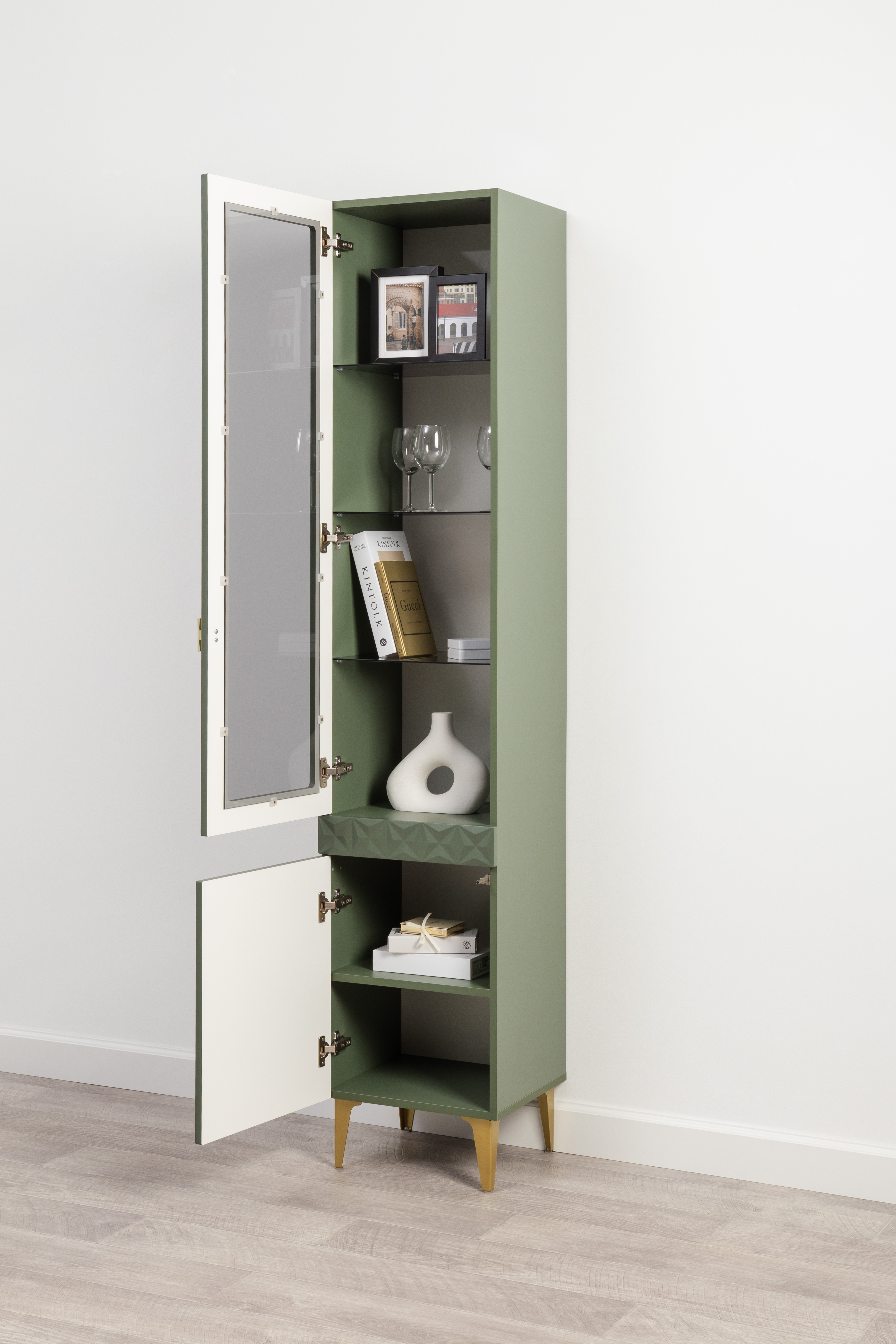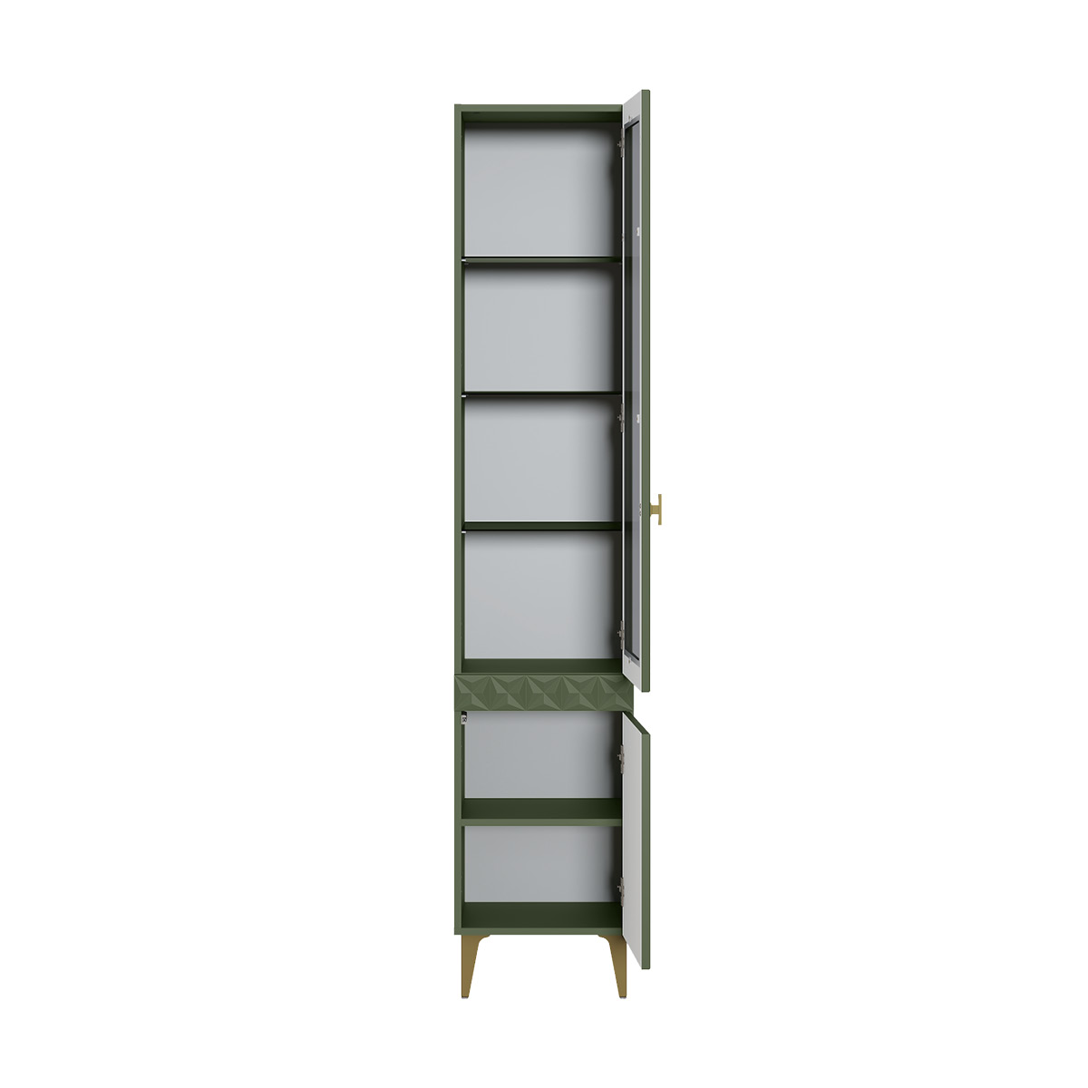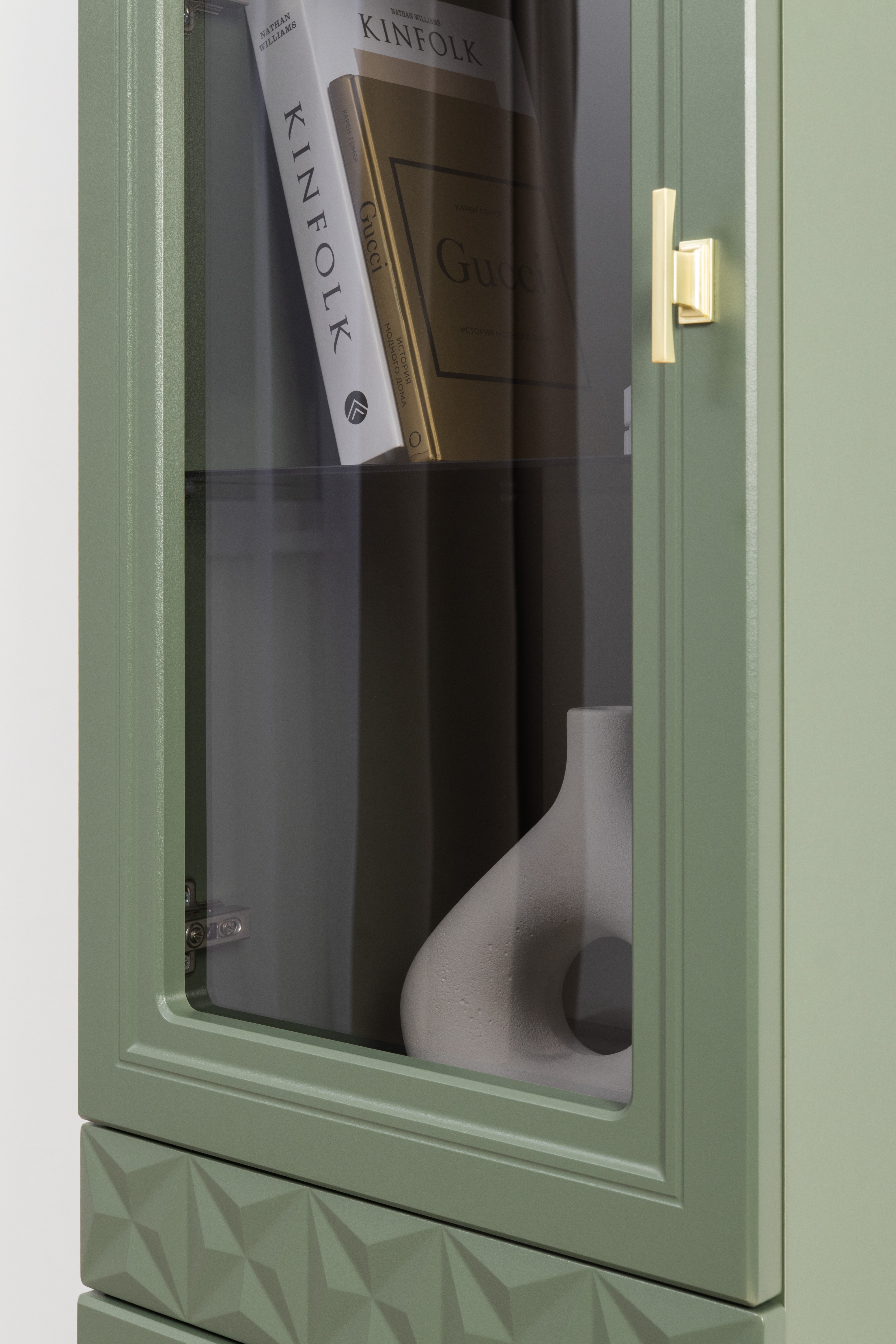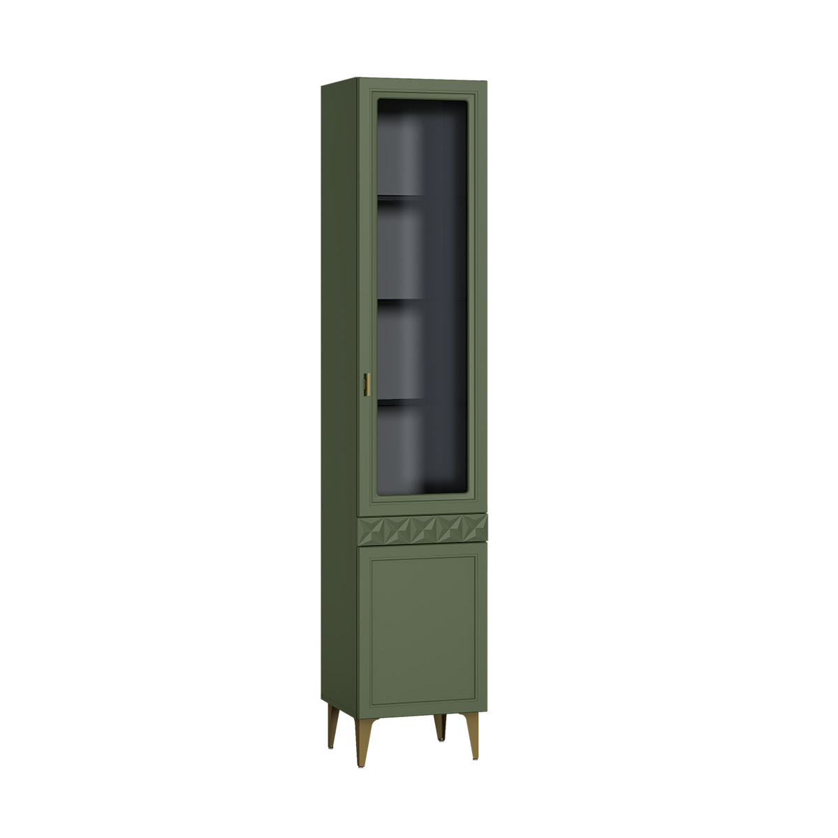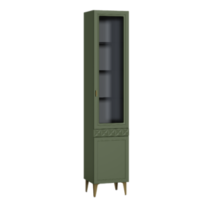 Шкаф-витрина Марион 16.397.01 дымчатый зеленый K521, олива шагрень AG 1050 ПВХ (собирается на любую сторону)