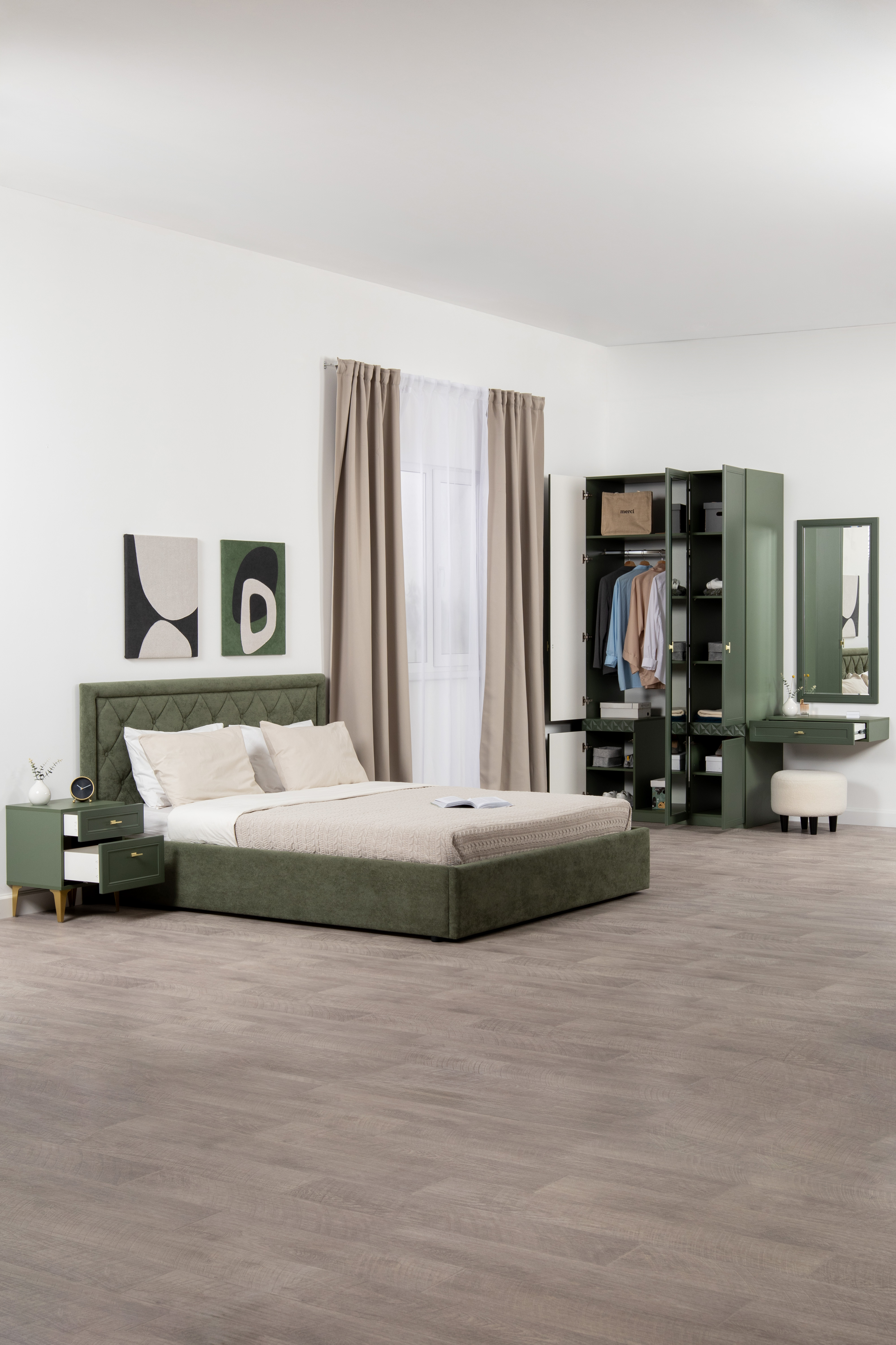 Спальня Дакота композиция 1 меренга, белый, с кроватью Ингрид/Ingrid 1600 велюр ультра смог/ultra smoke, пуф Альба 450 велюр ультра смог/ultra smoke