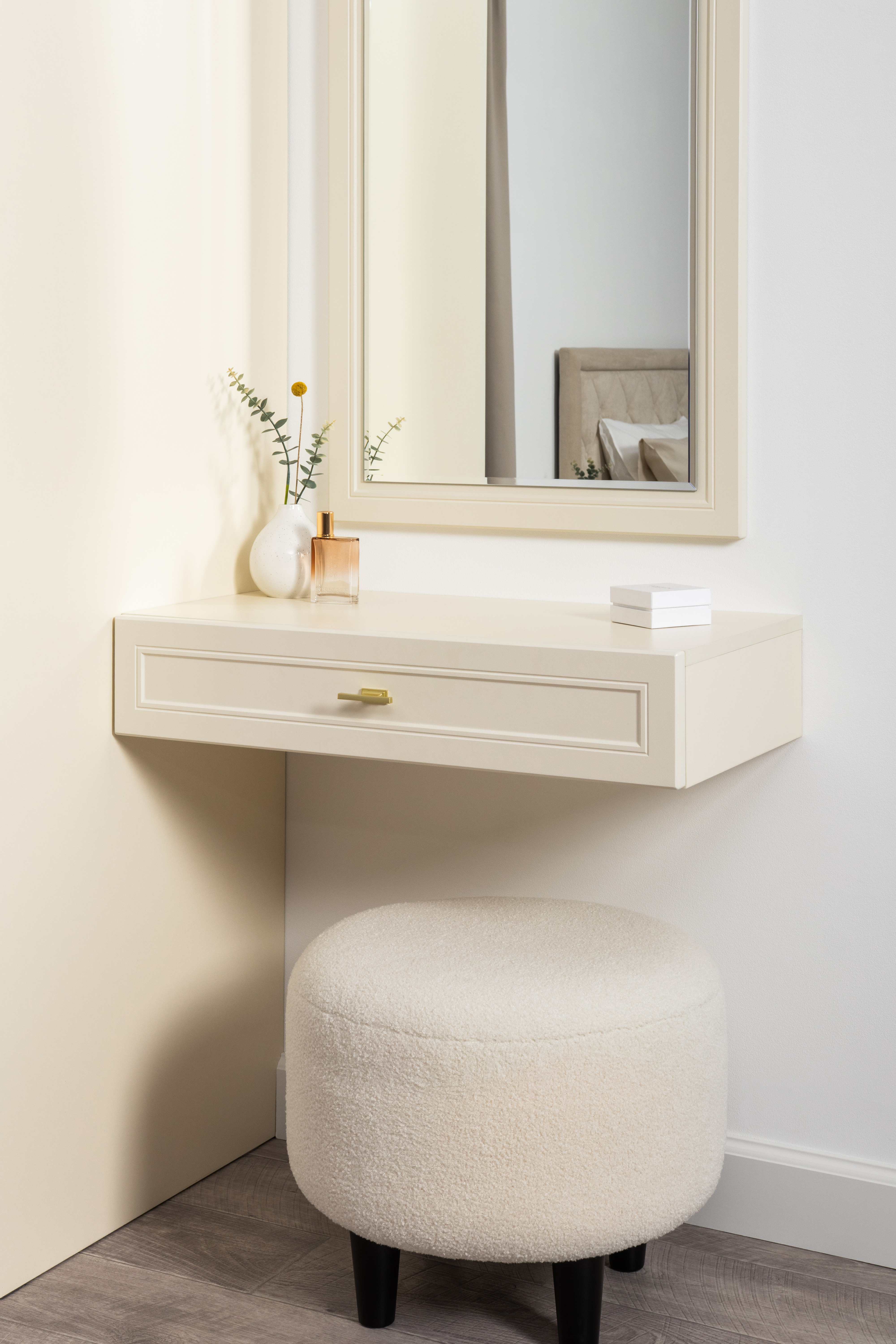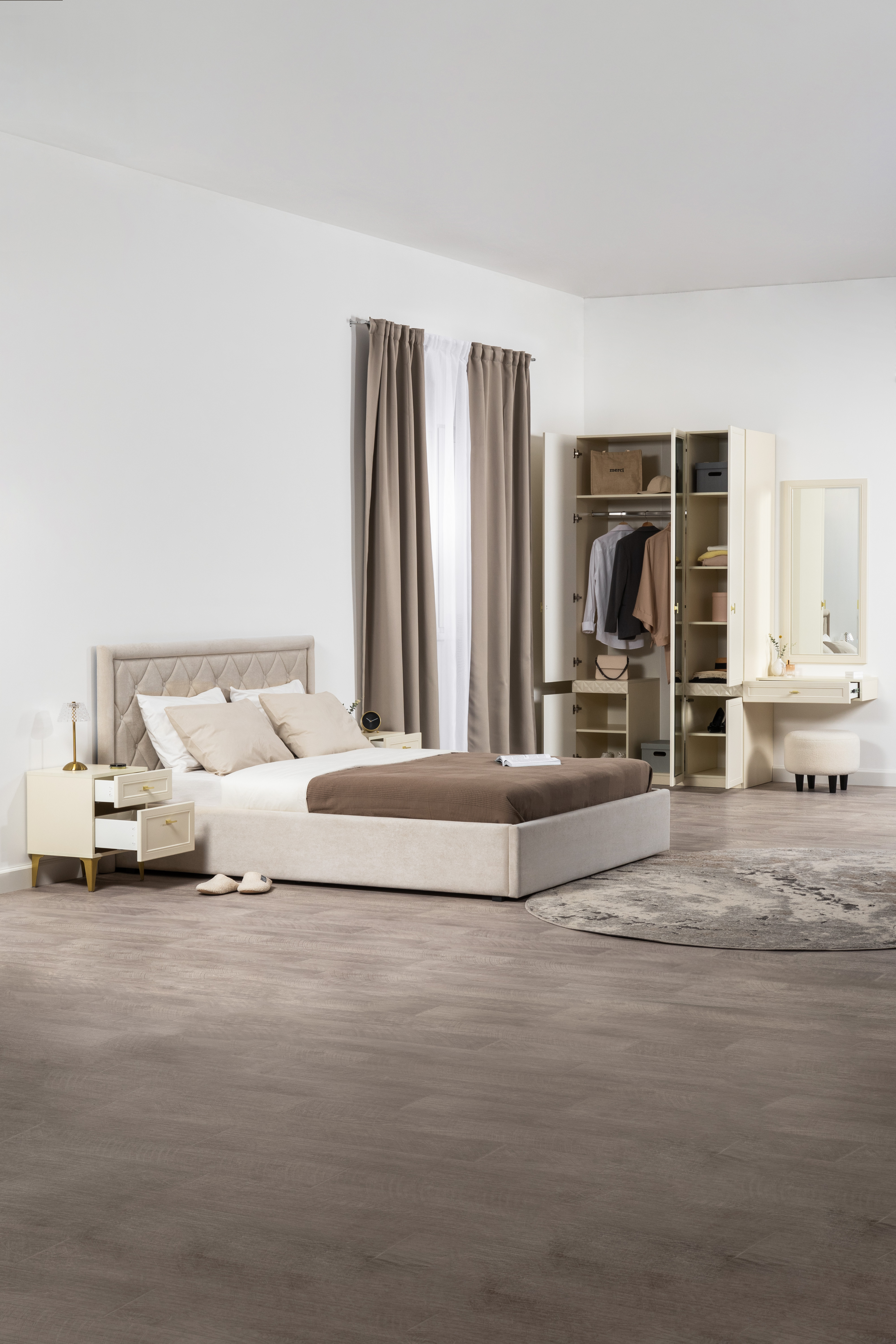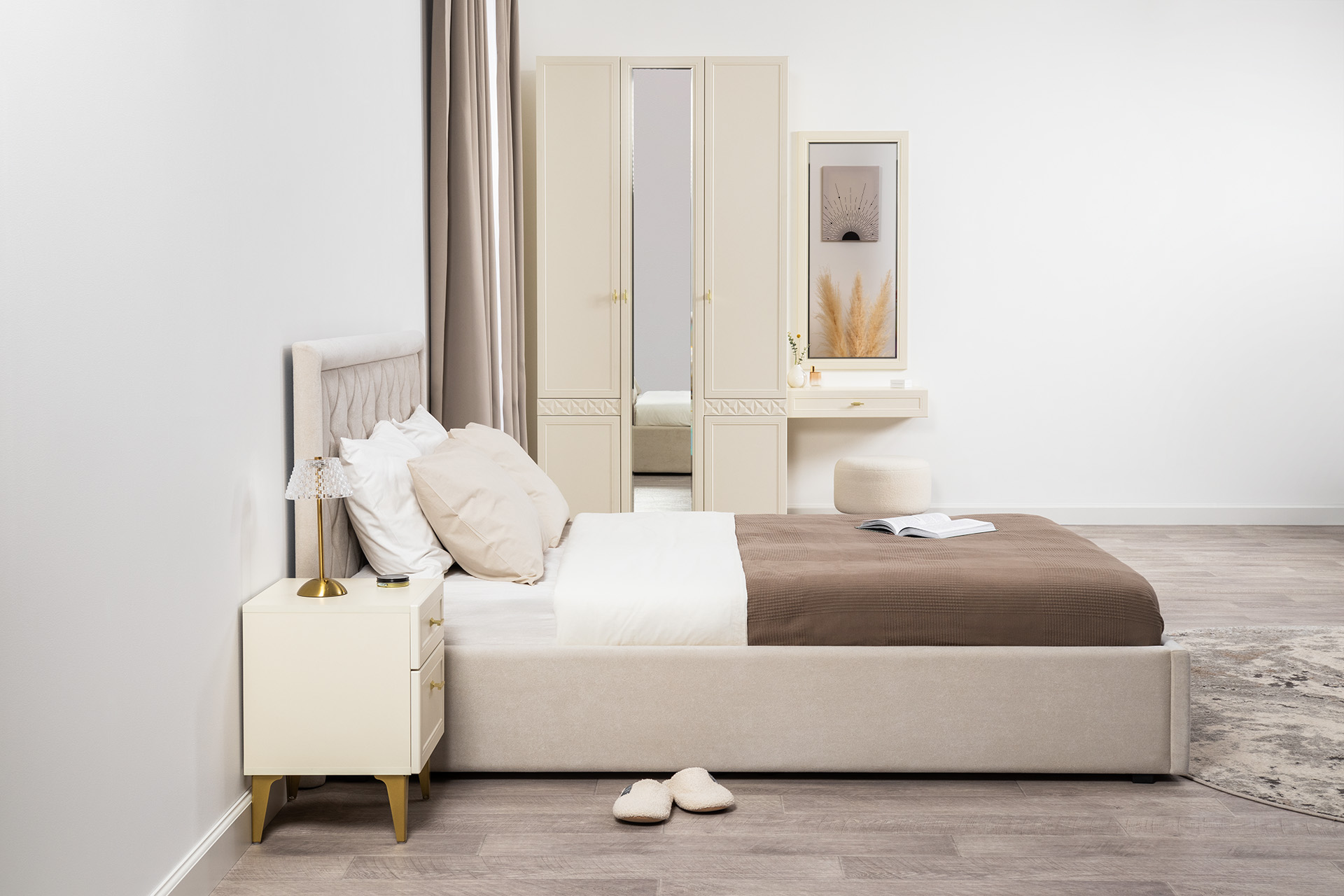 Спальня Дакота композиция 1 меренга, белый, с кроватью Ингрид/Ingrid 1600 велюр ультра смог/ultra smoke, пуф Альба 450 велюр ультра смог/ultra smoke